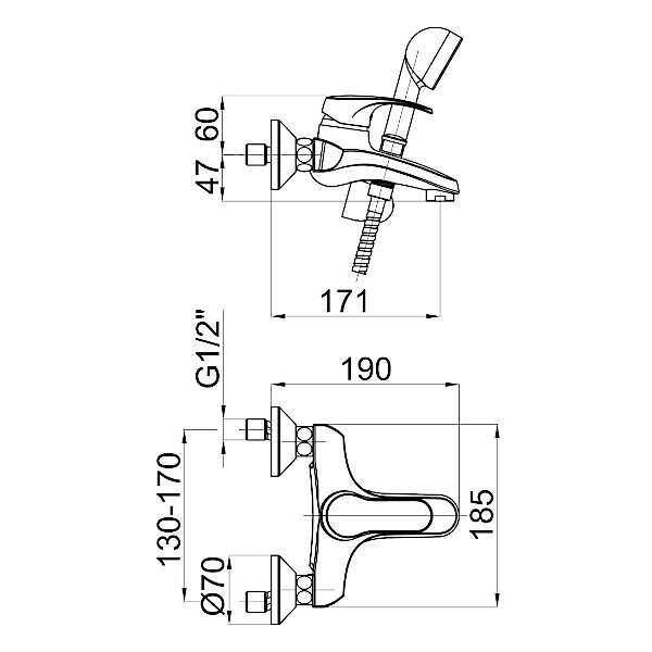 Armatura za kad s cevjo dolžine 150 cm, tuš ročko in stenskim držalom. Art. Harmony H30 00393, Unitas.