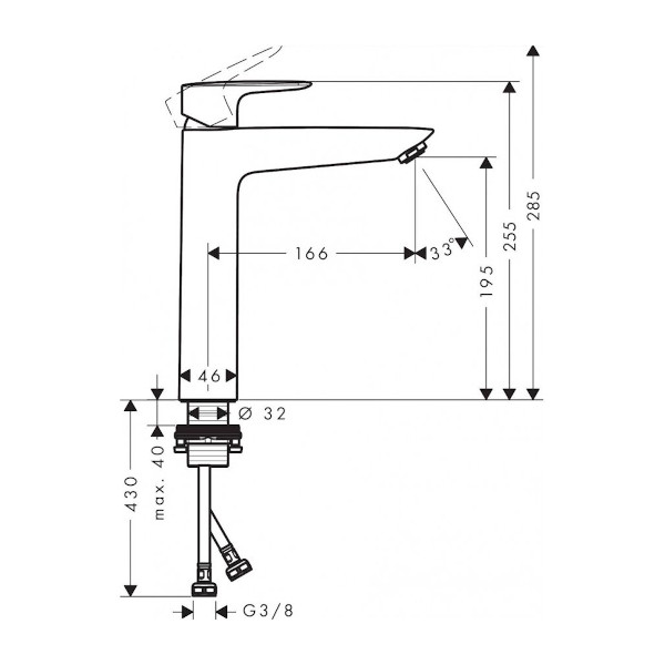 - Višina do izliva: 195 mm