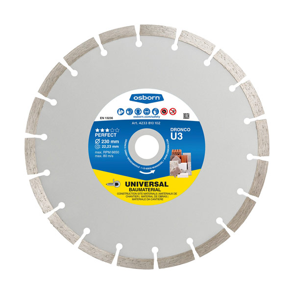 Sintrana segmentirana diamantna rezalna plošča namenjena za mokro ali suho obdelavo splošnih materialov iz gradbišč, kot so beton, apnenec, peščenjak, opeka ipd.