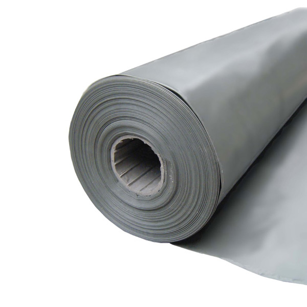 Siva gradbena folija, ki preprečuje vdor vlage in vode. Za uporabo v gradbeništvu.