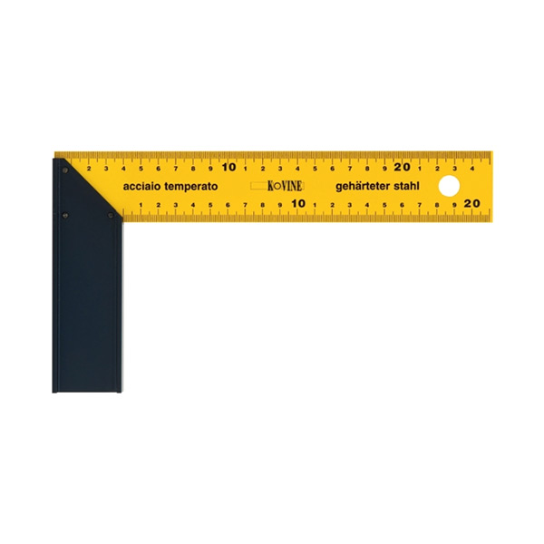 Mizarski kotnik z merilnim krakom 40 x 1,2 mm iz poboljšanega jekla, z milimetrsko skalo. Z naslonom iz črno eloksiranega aluminijastega profila, I-oblike 40 x 14 mm. Praškasto lakirano v rumeni barvi.