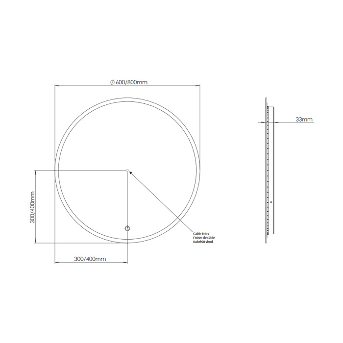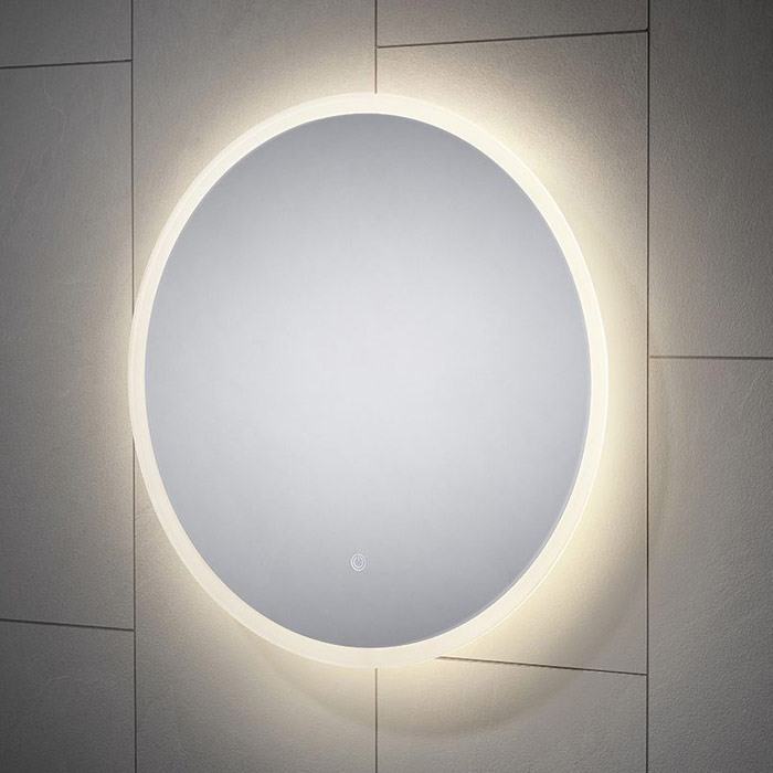 Stensko ogledalo okrogle oblike s hrbtno LED osvetlitvijo, senzorjem na dotik in funkcijo razmeglitve.