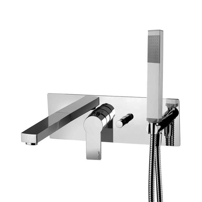 Stenska podometna enoročna mešalna armatura Tango z ročno prho, cevjo in preklopom. Sodoben in privlačen set za kopalniško kad.