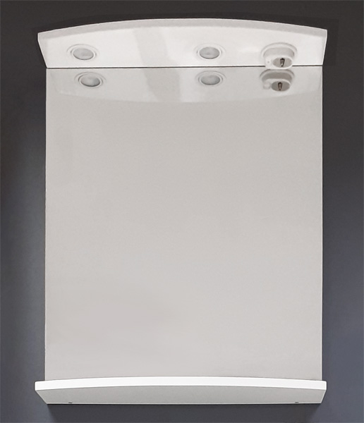 Stensko kopalniško ogledalo Linea Slim v beli barvi, s poličko, dvema halogenskima lučkama in električno vtičnico.