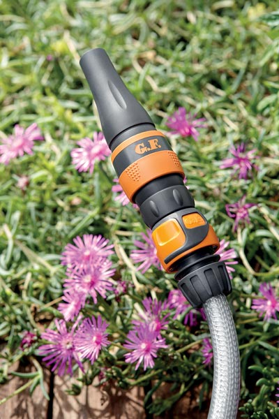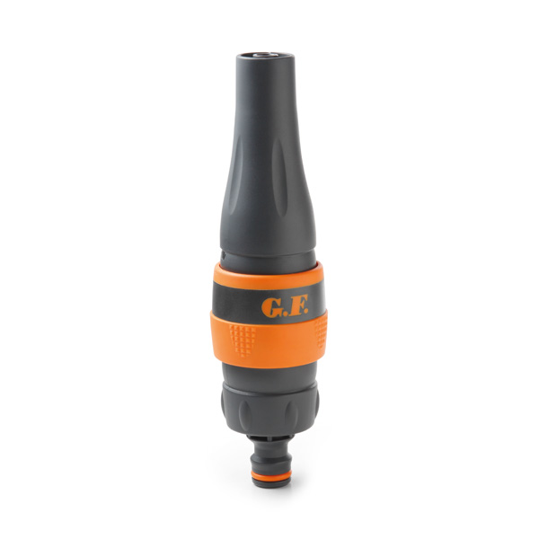 Brizgalka vode za zalivanje vrtov in čiščenje površin, s plastičnim ohišjem in mehkim gumiranim oprijemom in regulatorjem načina in jakosti vodnega curka.